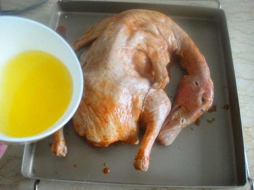 3. 取出鸭子,用刷子将腌料均匀涂抹在鸭皮上;