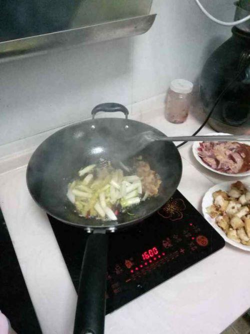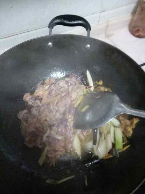 - 放入五花肉翻炒至变色,加入葱姜蒜继续翻炒。